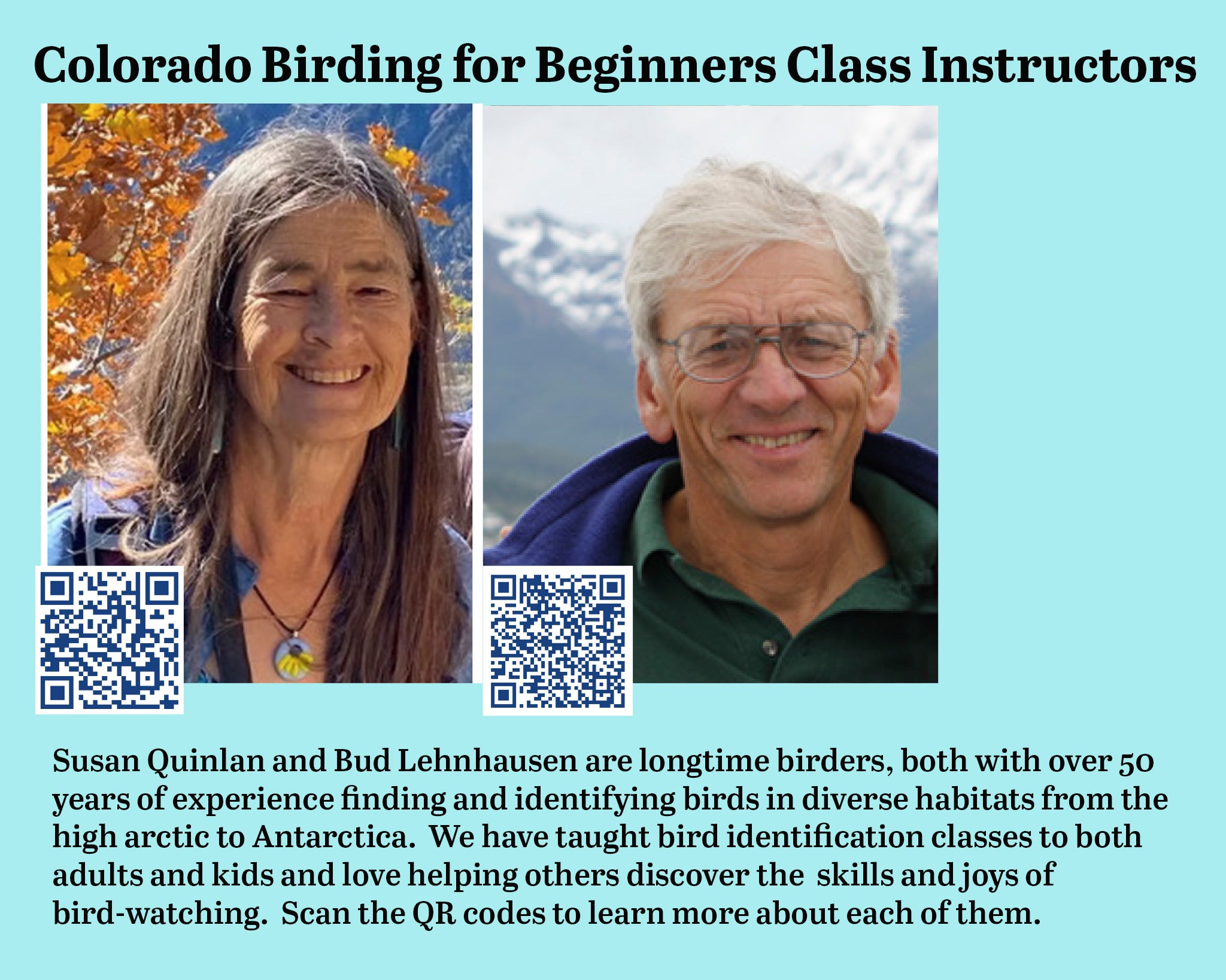 Have you always wanted to learn more about our local Colorado birds? What species are around here? How and where can you find them? How can you figure out what bird you are seeing or hearing? Join Susan Quinlan and Bud Lehnhausen this May as they share their photos, knowledge and experiences to kick-start your interest in birds and possibly inspire you to begin a lifetime of birding adventures.